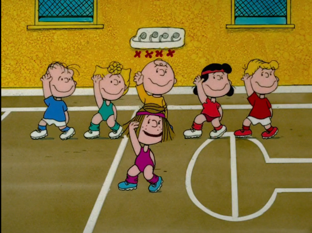 The song is "She's in Shape" which is sung by Peppermint Patty. Everyone is wearing the most 80's exercise wear worn. The moves were apparently inspired by Charles Schulz then 12-year-old daughter. It's an alright song, I like the part that sounds like it's inspired by "Hey Mickey". You will know that Peppermint Patty is in shape.