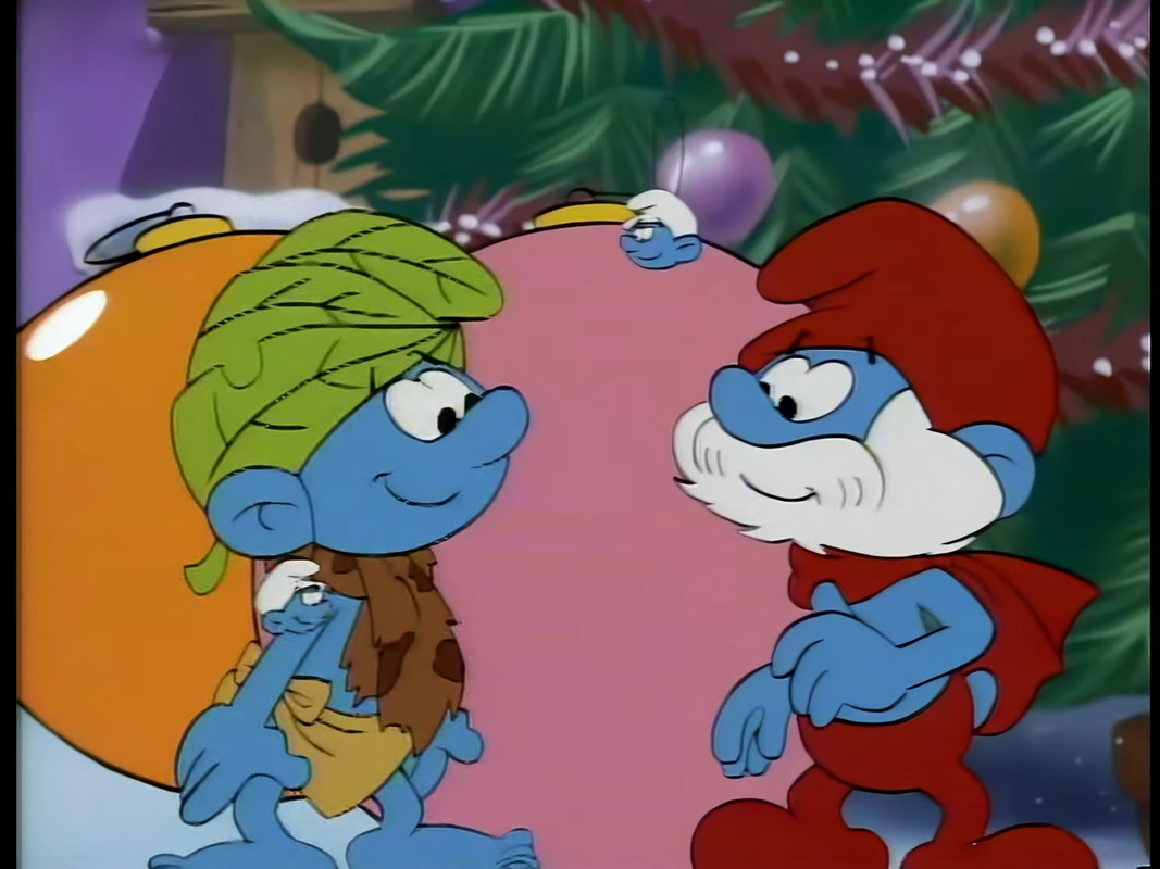 It starts with Wild Smurf, a Smurf who's like a Tarzan Smurf, being wild, I'm surprised Brainy and a few others got mad he's being wild while trying to help them put up Christmas stuff, his name is Wild. Also it's supposed to be Wild's first Christmas. Wild's backstory, not from this special, is that he's a Smurf that got lost from the others when he was born or whatever Smurfs do, and was raised by squirrels. (I guess the squirrels don't know what Christmas is.) Papa Smurf being himself, wants the others to be patient and understand.