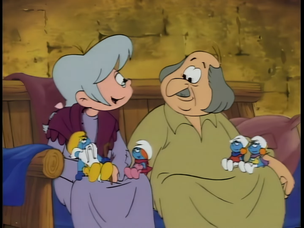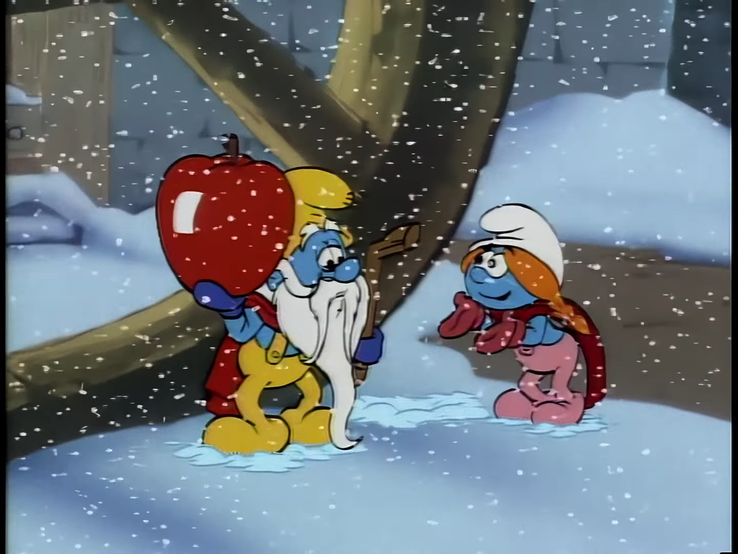 Papa Smurf is going to give a gift and leave the special for a bit, but he has dropped something that our special will then focus on. Grandpa Smurf and Sassette, yes there's a Grandpa Smurf, have gone into the village to show her what Christmas Eve is like for humans. Why, just her? Nobody knows.