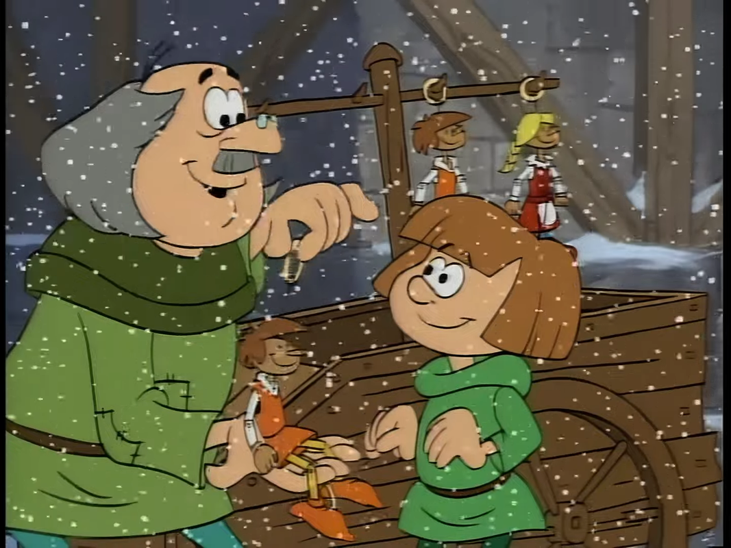 The boy's father, the boy is named Hans and his father who is some rich guy is annoyed and grabs the boy and runs off. We also learn the old man's name is Gustav. Thankfully, Sassette is very interested in what's going and wants to follow him to find out more of the story. Gustav's wife , Elise, has random unnamed disease. The Doctor says she needs the power of Christmas can help her or she might die? ( Take two Christmas and call me in the morning)
